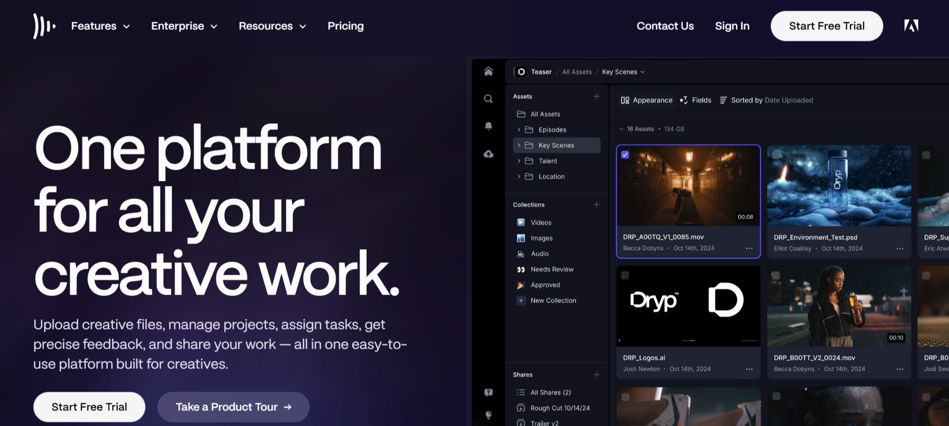 Frame io specializes in professional video review and collaboration through cloud based workspaces trusted by major studios and creative agencies. The web based platform provides time stamped commenting, annotation tools, and version control supporting complex production workflows requiring precise feedback.