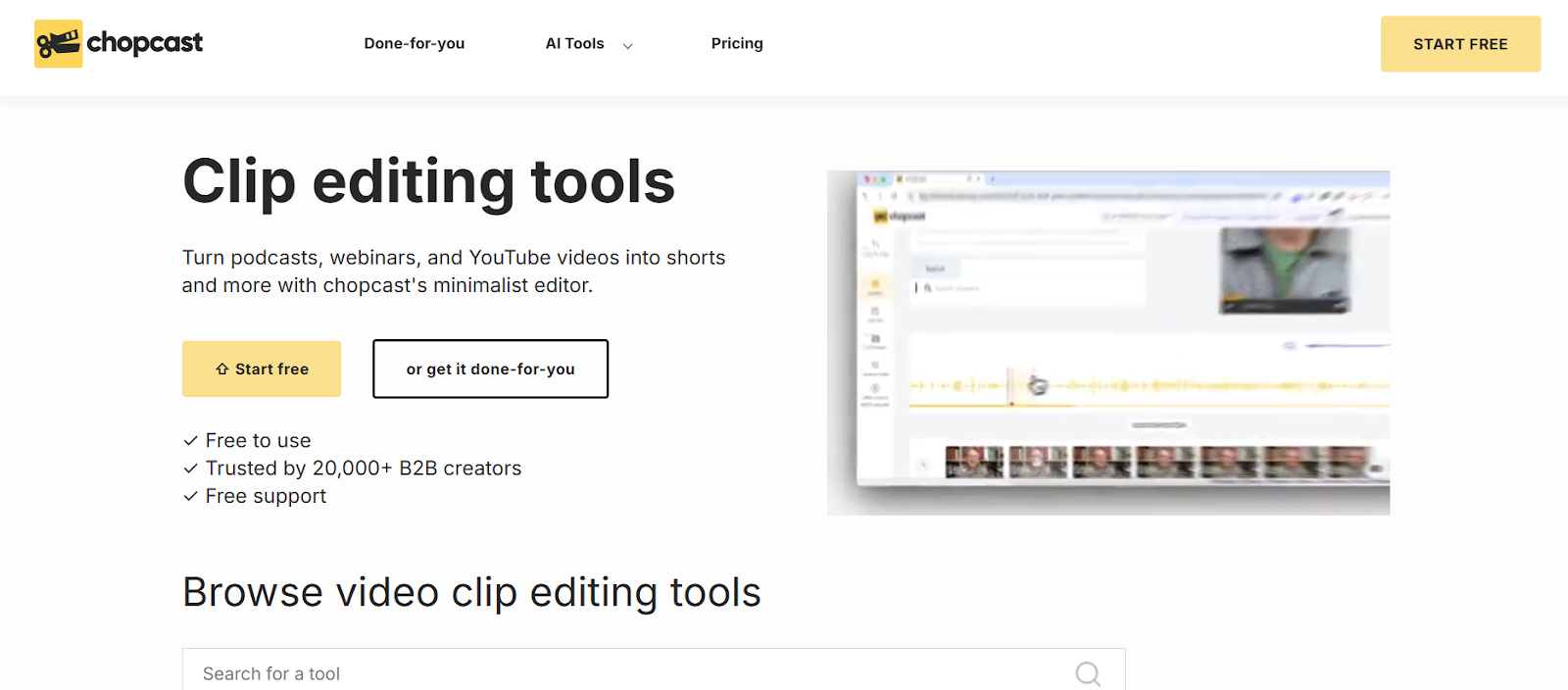 Chopcast focuses on business content suggestions with AI identifying key insights and engaging moments in professional videos automatically. The web based platform suggests clips carefully, picking moments adding genuine value to narratives rather than generic entertainment peaks.