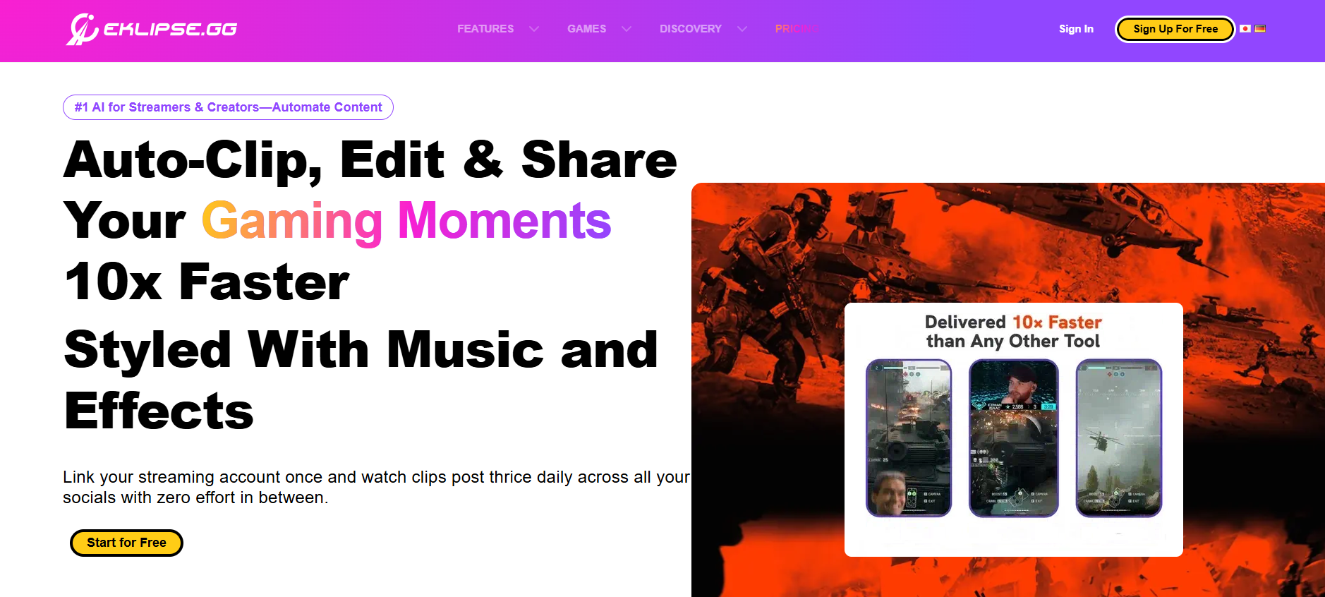 Eklipse dominates gaming highlight detection with training across 1,000 plus games including precise event recognition. The web based platform detects real in game events like kills, clutches, objectives, and victories rather than random motion or audio spikes that create meaningless clips.