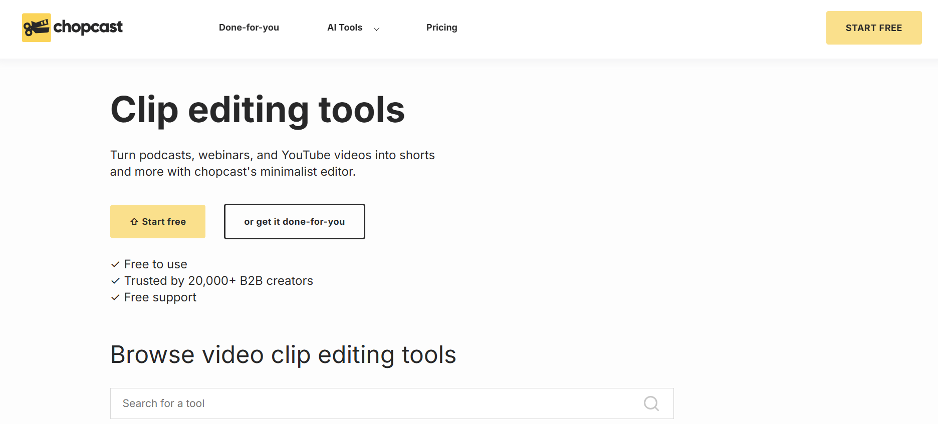 Chopcast focuses on business content with AI that identifies key insights, actionable advice, and engaging moments in professional videos automatically. The web based platform scans content carefully, picking up moments that add genuine value to narratives rather than generic entertainment peaks.